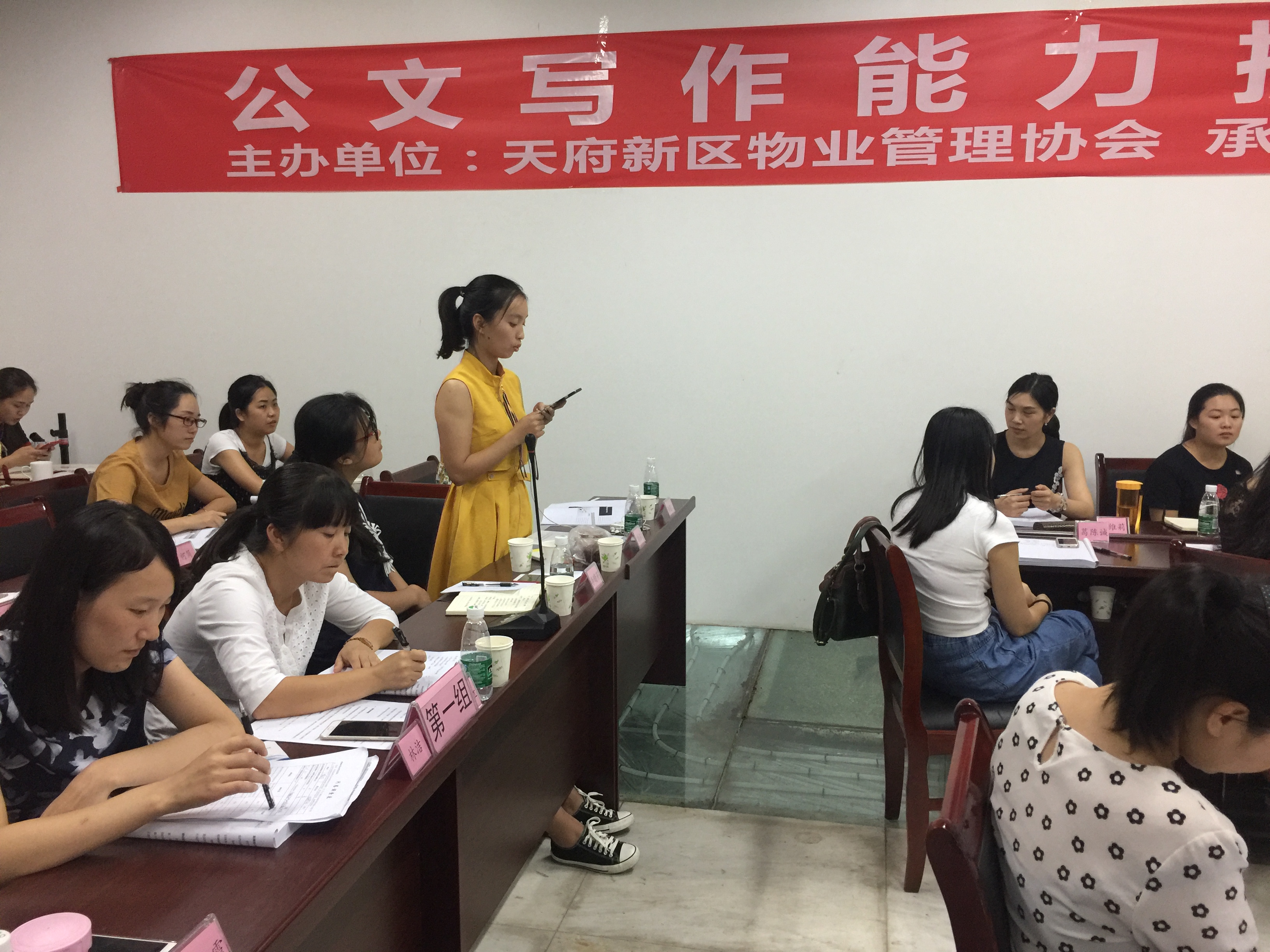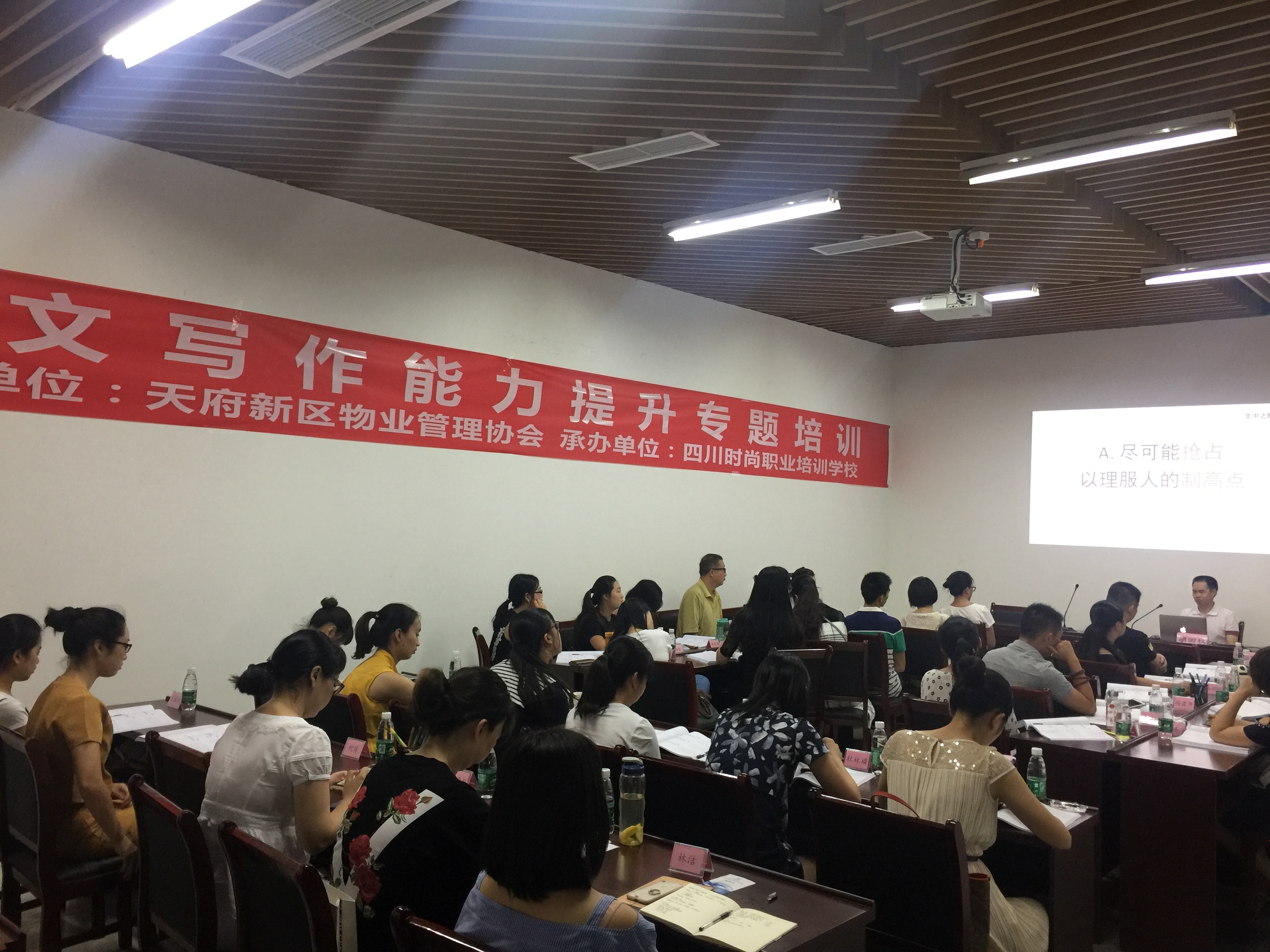 为提升天府新区各物业服务企业行政管理人员公文写作能力, 2017年7月29至30日,成都天府新区物业协会与四川省时尚职业培训学校在区物协服务中心会议室联合举办了为期两天的公文写作能力提升的培训学习。这次培训特别邀请到了资深公文写作专家、四川公务员培训中心特邀公文写作讲师胡国权老师和北京亚太教育研究院副院长、《物业教育资讯》专刊主编张海港老师作主讲嘉宾。