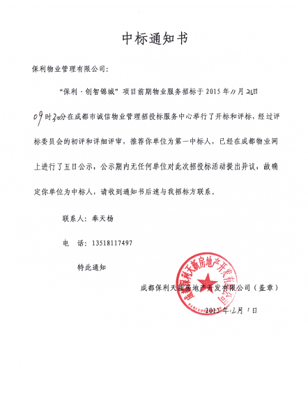 保利.创智力锦中标通知书