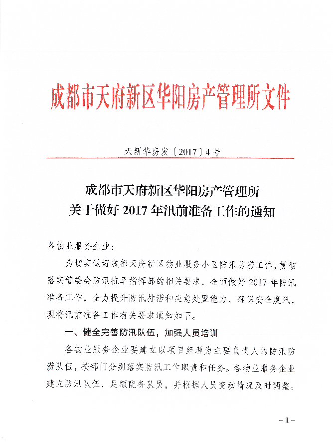 成都市天府新区华阳房产管理所关于做好2017年汛前准备工作的通知