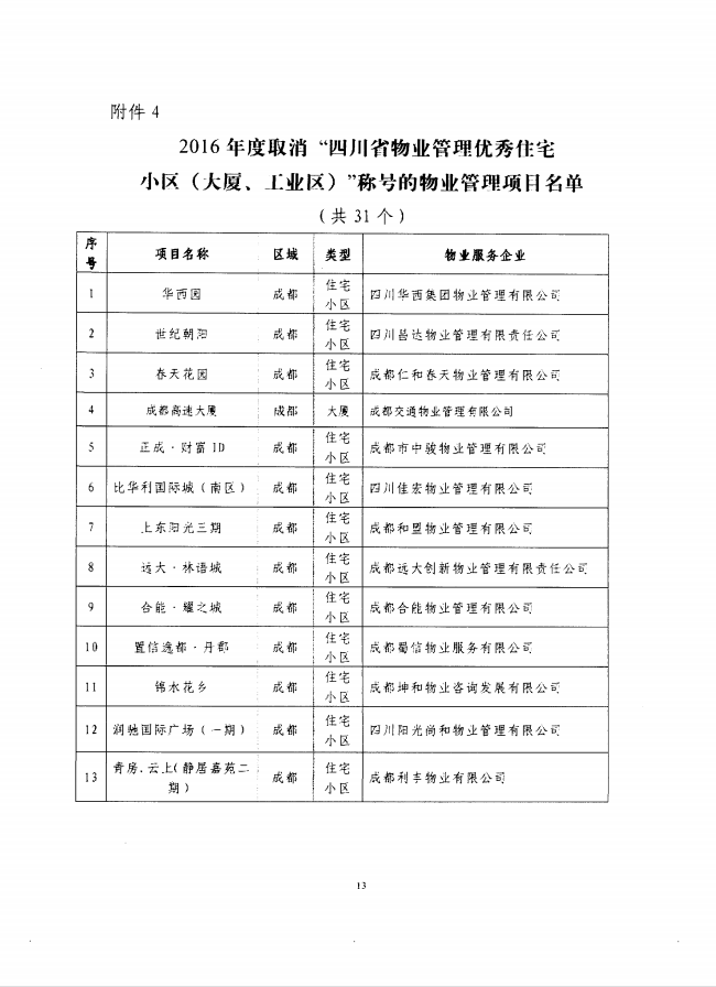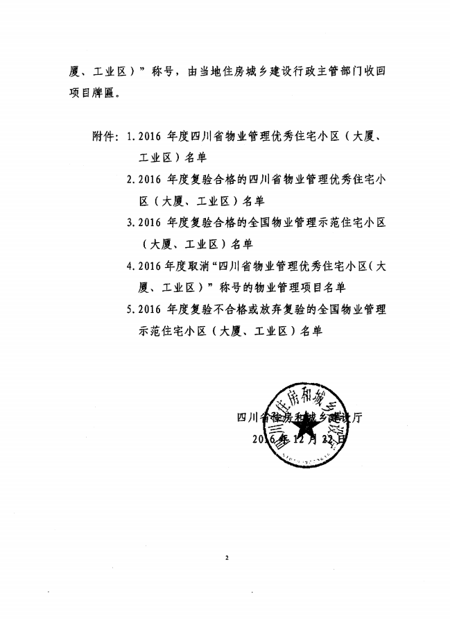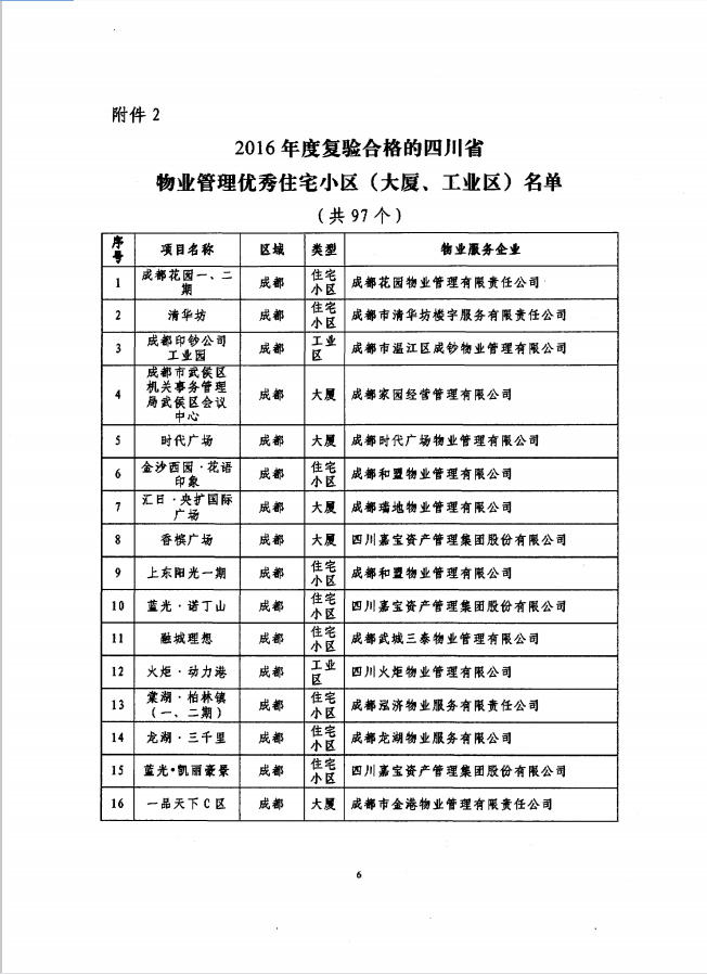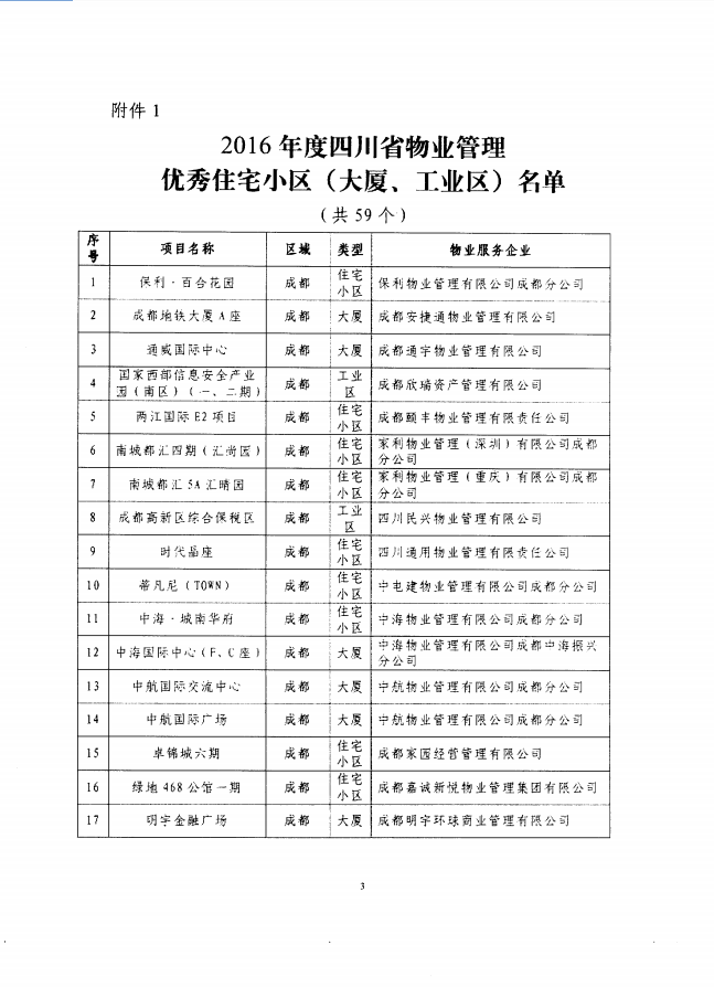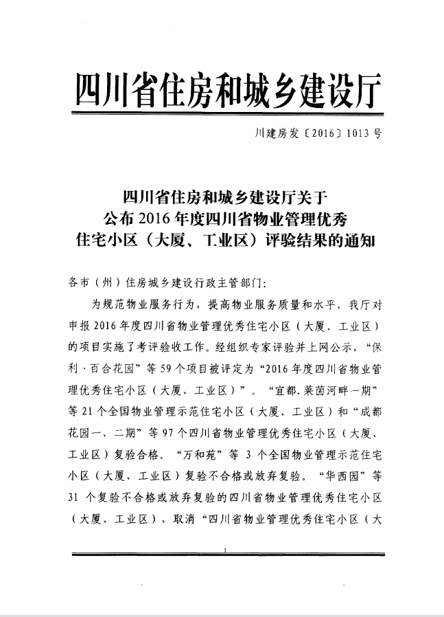 请“2016年度四川省物业管理优秀住宅小区(大厦、工业区)”获奖单位(名单见附件),自2017年4月18日起到四川省住房和城乡建设厅四川房地产网领取四川省物业管理优秀住宅小区(大厦、工业区)奖牌。