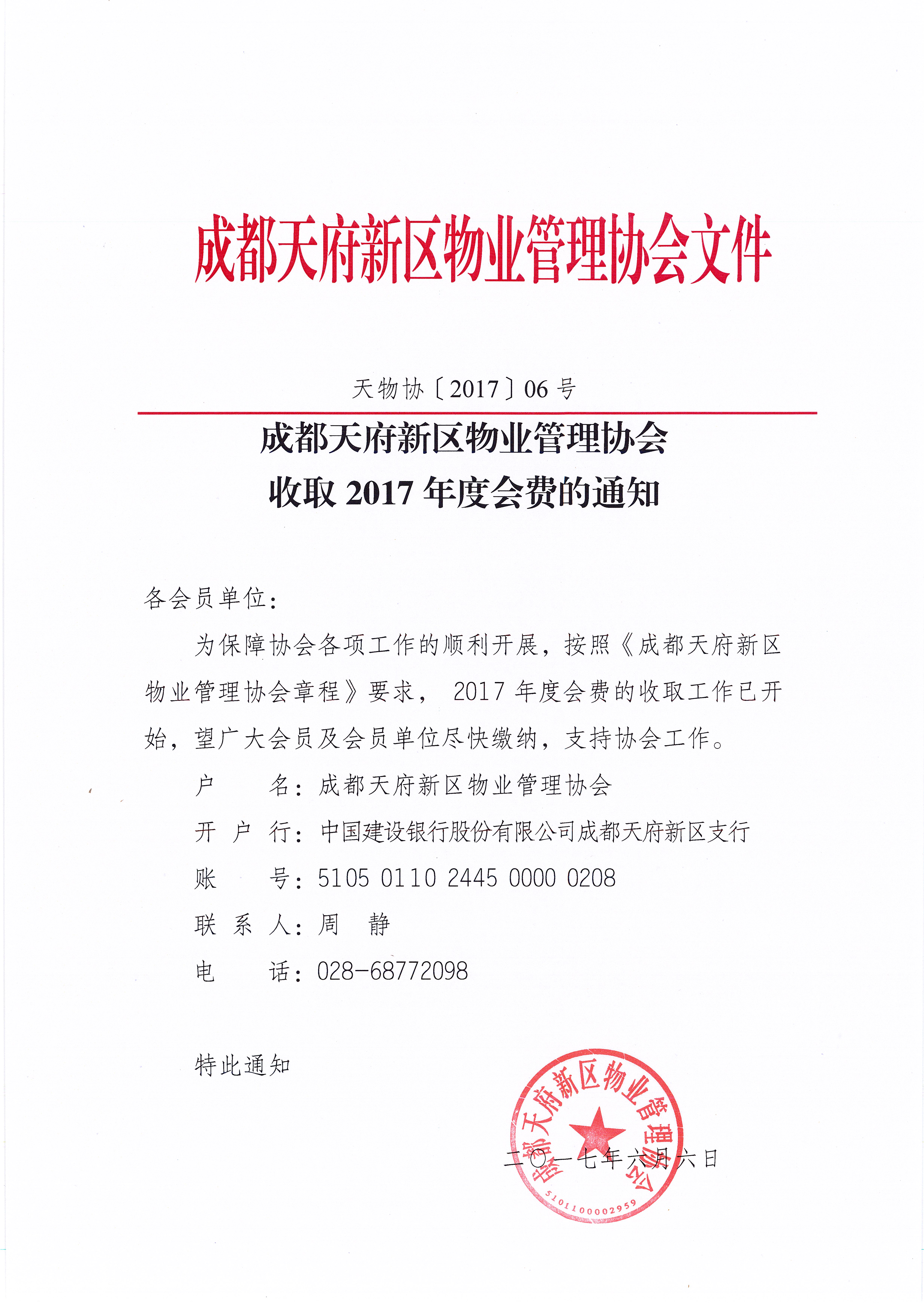 关于成都天府新区物业管理协会收取2017年度会费的通知