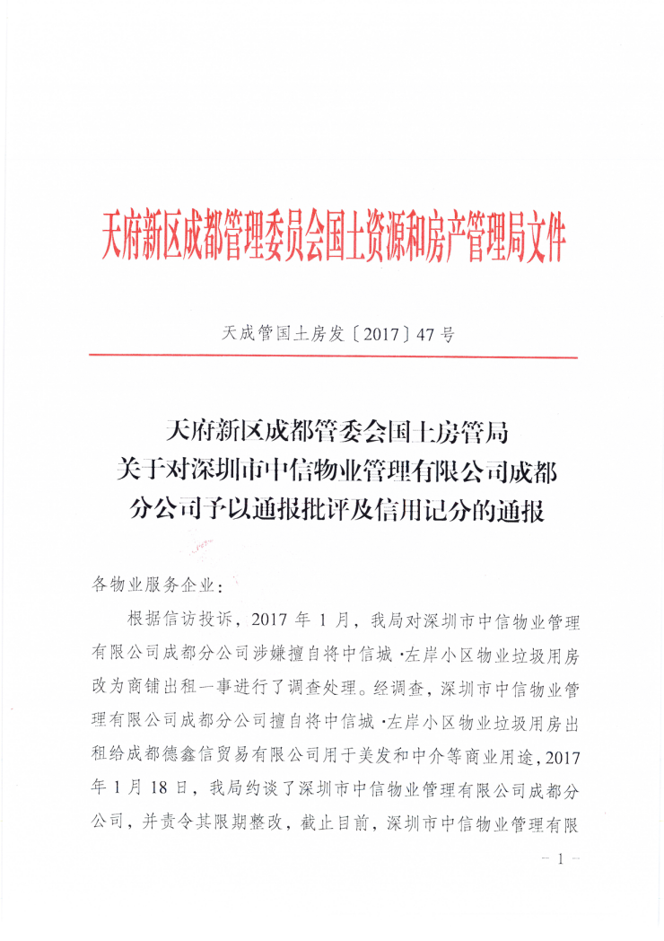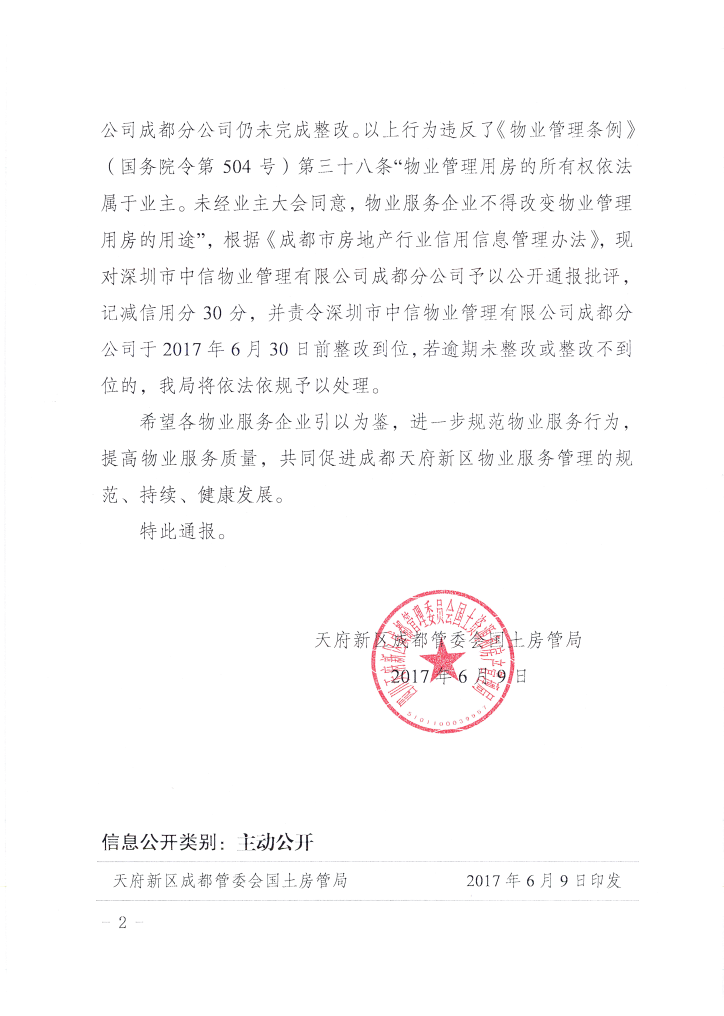 关于对深圳市中信物业管理有限公司成都分公司予以通报批评及信用记分的通报