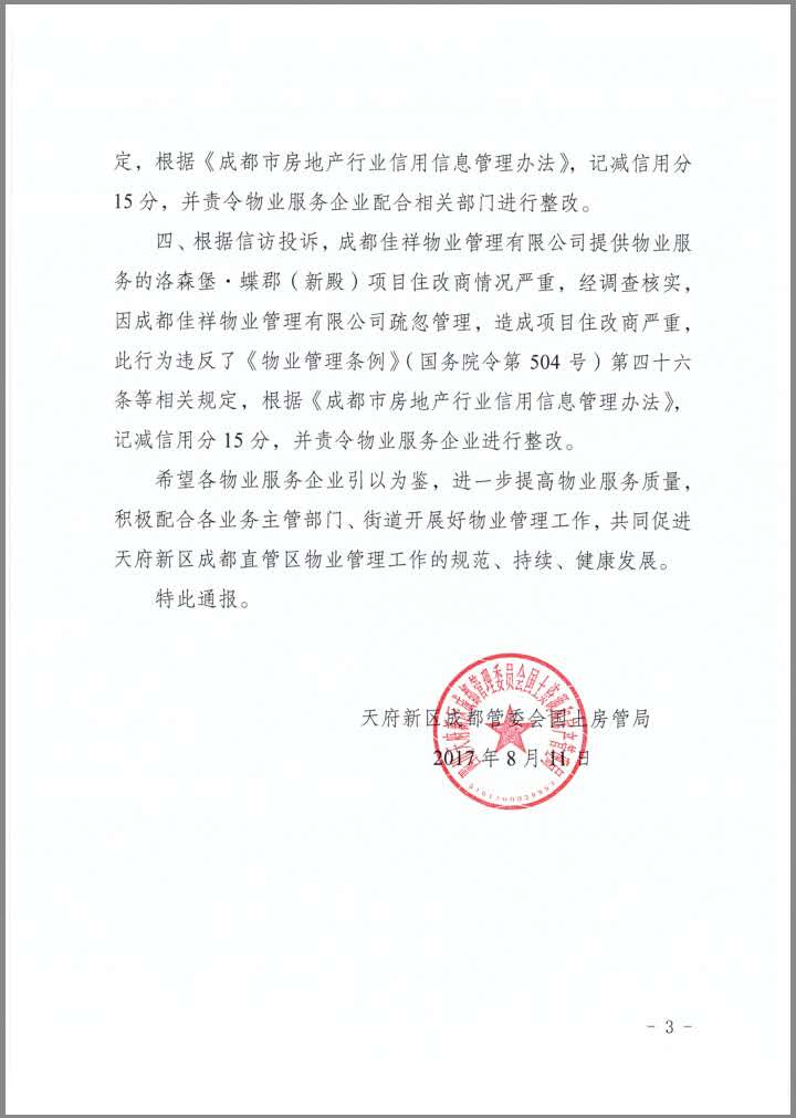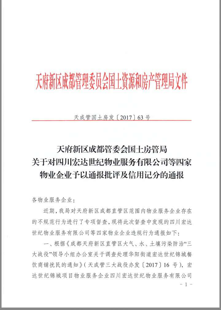天府新区成都管委会国土房管局关于对四川宏达世纪物业服务有限公司等四家物业企业予以通报批评及信用记分的通报