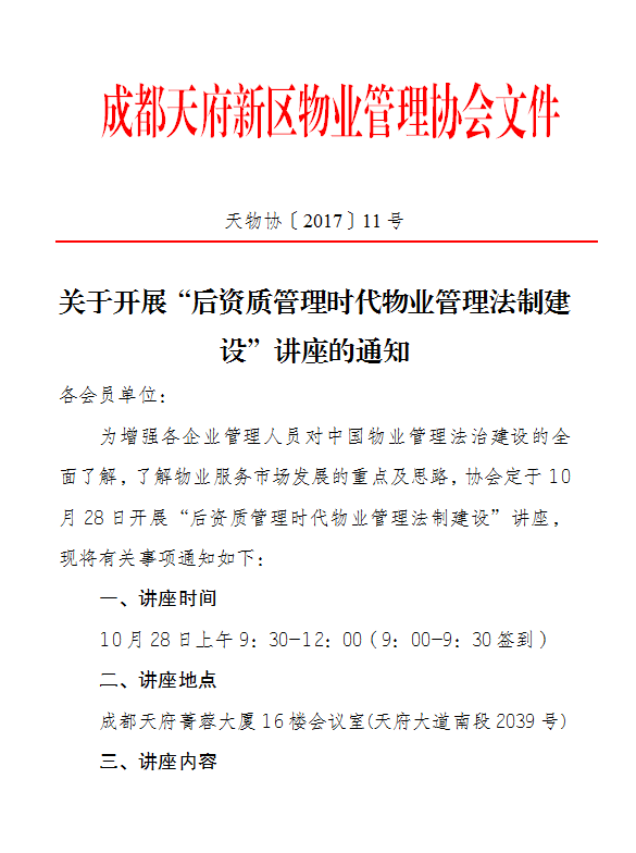 关于开展“后资质管理时代物业管理法制建设”讲座的通知
