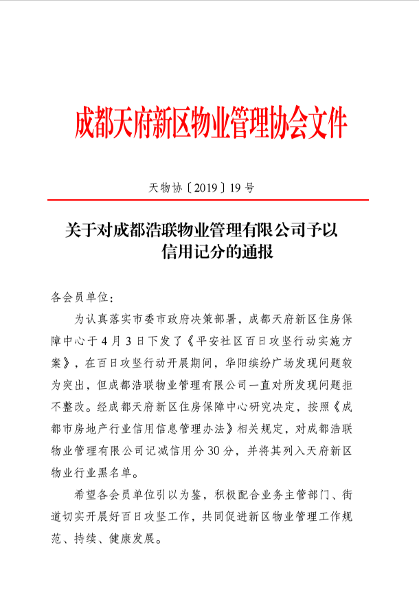 关于对成都浩联物业管理有限公司予以信用记分的通报