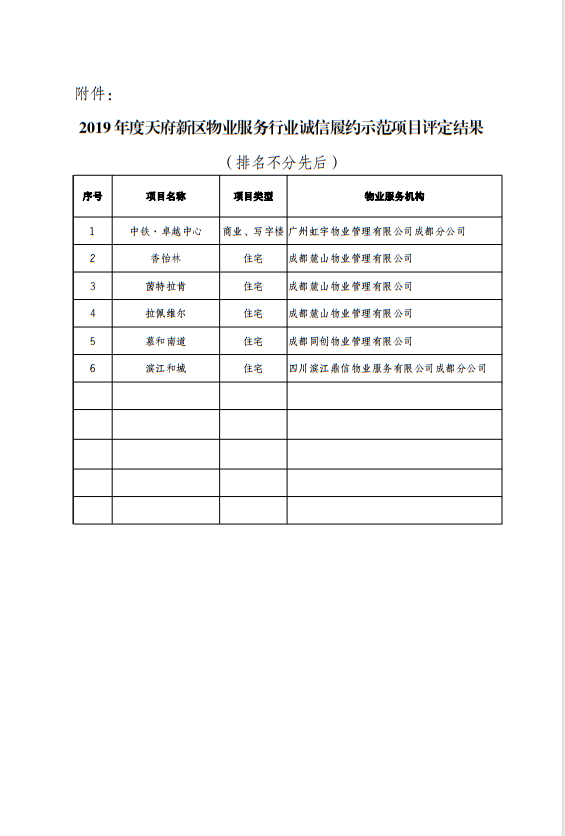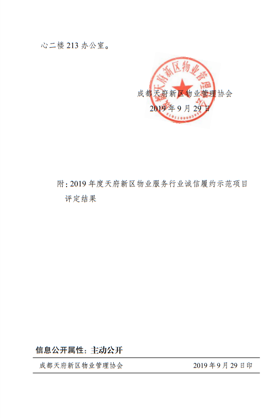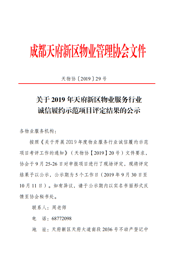 关于2019年天府新区物业服务行业诚信履约示范项目评定结果的公示