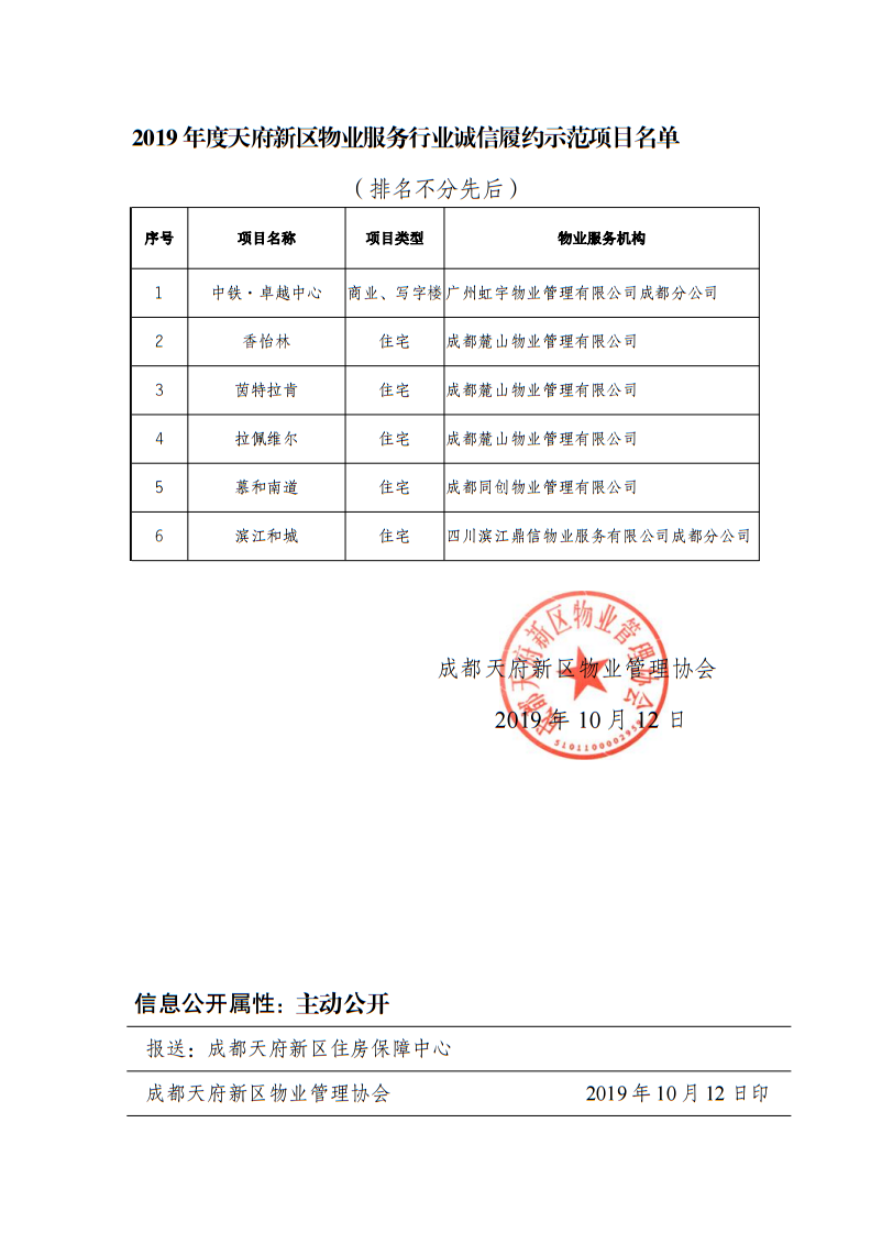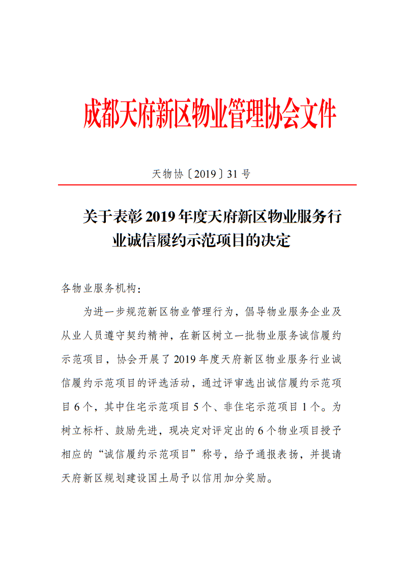 关于表彰2019年度天府新区物业服务行业诚信履约示范项目的决定